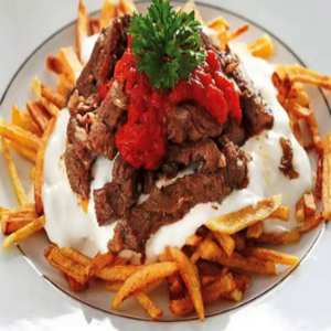 DOMATES, BİBER VE ÖZEL SOSLA TATLANDIRILMIŞ ANTRİKOT PARÇALARI KİBRİT PATATES VE YOĞURT.